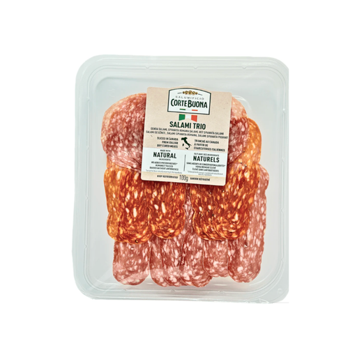 Corte BuonaA mix of three Italian favourites: Genoa Salami, Spianata Romana, and Hot Spianata. Thinly sliced and ready to serve. Conveniently packed in 100 g...
